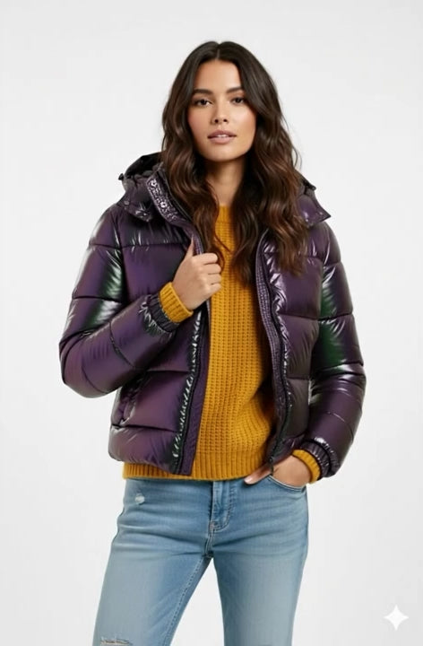 Doudoune violette brillante pour femme, chaude et stylée à 39,99€. Pour un article acheté, un autre est offert. C’est le moment de te faire plaisir 💜