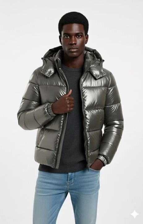 Doudoune grise brillante pour Homme avec cœur argenté, chaude et stylée à 39,99 €. Pour un article acheté, un autre est offert. C’est le moment de te faire plaisir 🤍.